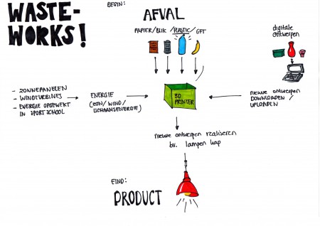 Met mijn Waste-Works! 3D printer wil ik het probleem aanpakken van de steeds groter wordende afvalberg. Ik wil het mogelijk maken dat mensen hun eigen plastic (en ander) afval verzamelen en daarvan thuis nieuwe producten maken. Zo zien mensen de waarde van afval in! Ik wil me in het begin richten op het verwerken van plastic tot nieuwe producten, omdat op dit moment plastic een van de grootste milieuproblemen veroorzaakt . Daarna wil ik mij ook richten op verwerking van andere soorten afval zoals papier, blik en gft-afval. De printer zou moeten draaien op duurzame energie.