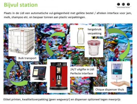 Plaats in de Lidl een automatische vul-gelegenheid met gelikte bestel / afreken interface voor jam, melk, shampoo etc. en bespaar tonnen aan plastic verpakkingen.